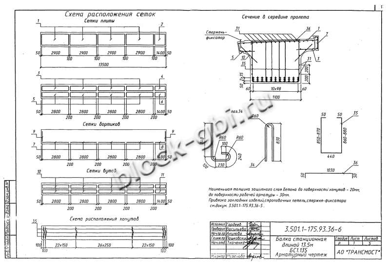 Балки мостовые железобетонные изготавливаются в соответствии с сериями 3.501.1-175.93 «Пролетные строения сборные железобетонные для железнодорожных мостов» и 3.503.1-81 «Пролетные строения сборные железобетонные длиной 12, 15, 18, 21 и 33 м из балок двутаврового сечения с предварительно напрягаемой арматурой для мостов и путепроводов, расположенных на автомобильных дорогах общего пользования, на улицах и дорогах в городах» и 3.501.1-146 «Пролетные строения сборные железобетонные длиной от 2,95 до 16,5 м для железнодорожных мостов».