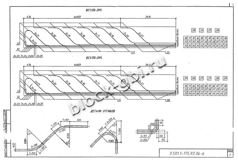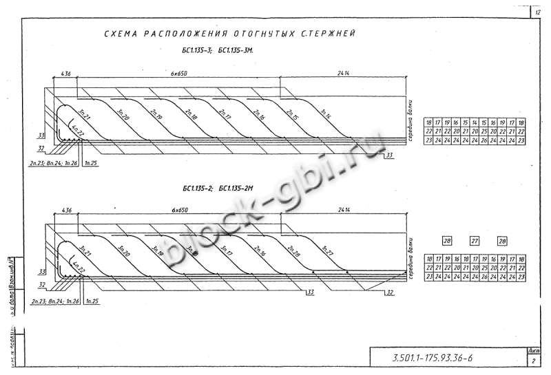 из ненапрягаемой или предварительно напряженной стали. Предварительно напрягаемая арматура изготавливается из высокопрочной холоднотянутой гладкой проволоки класса В и представляет собой пучок из 24х проволок. Пучки располагаются в нижнем уширении балки по горизонтали (в два ряда по высоте), и в стенках (в один ряд). Для балок длиной 23,6 м существует вариант армирования из 48 проволок. Ненапрягаемая арматура изготавливается из стали периодического профиля класса А-II или Ас-II и стали класса А-III. Рабочая арматура ненапрягаемых балок дополняется стержнями из гладкой стали класса А-I.